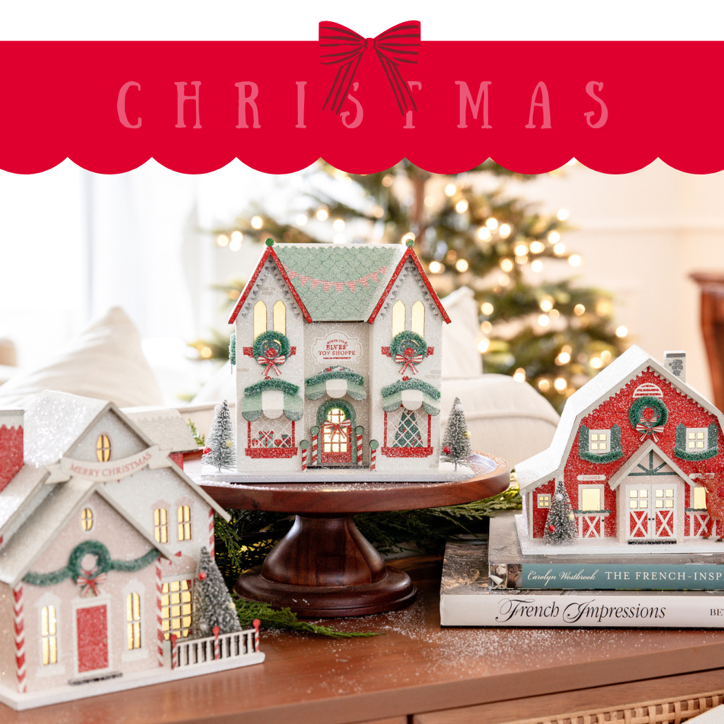 Candy‑colored light‑up houses, playful paper village pieces, napkins and plates invite nostalgic snowy charm and festive storytelling to your holiday décor.