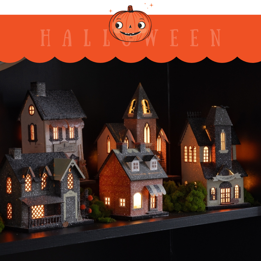 Bring eerie charm with Haunted Village. Mini haunted houses, spooky trees, and ghostly silhouettes create a magical, storybook Halloween scene.