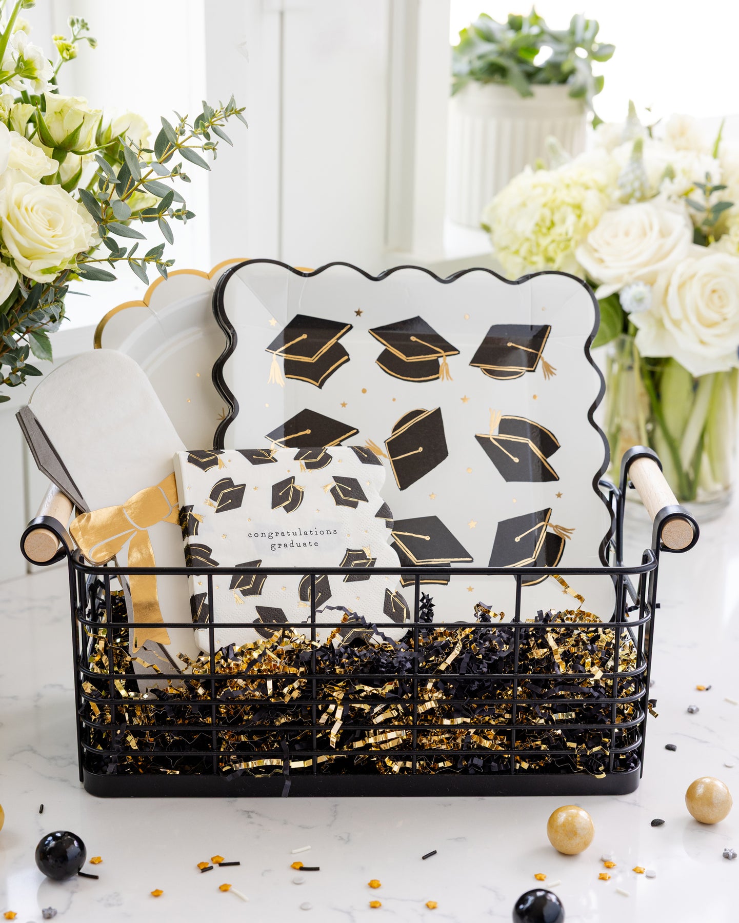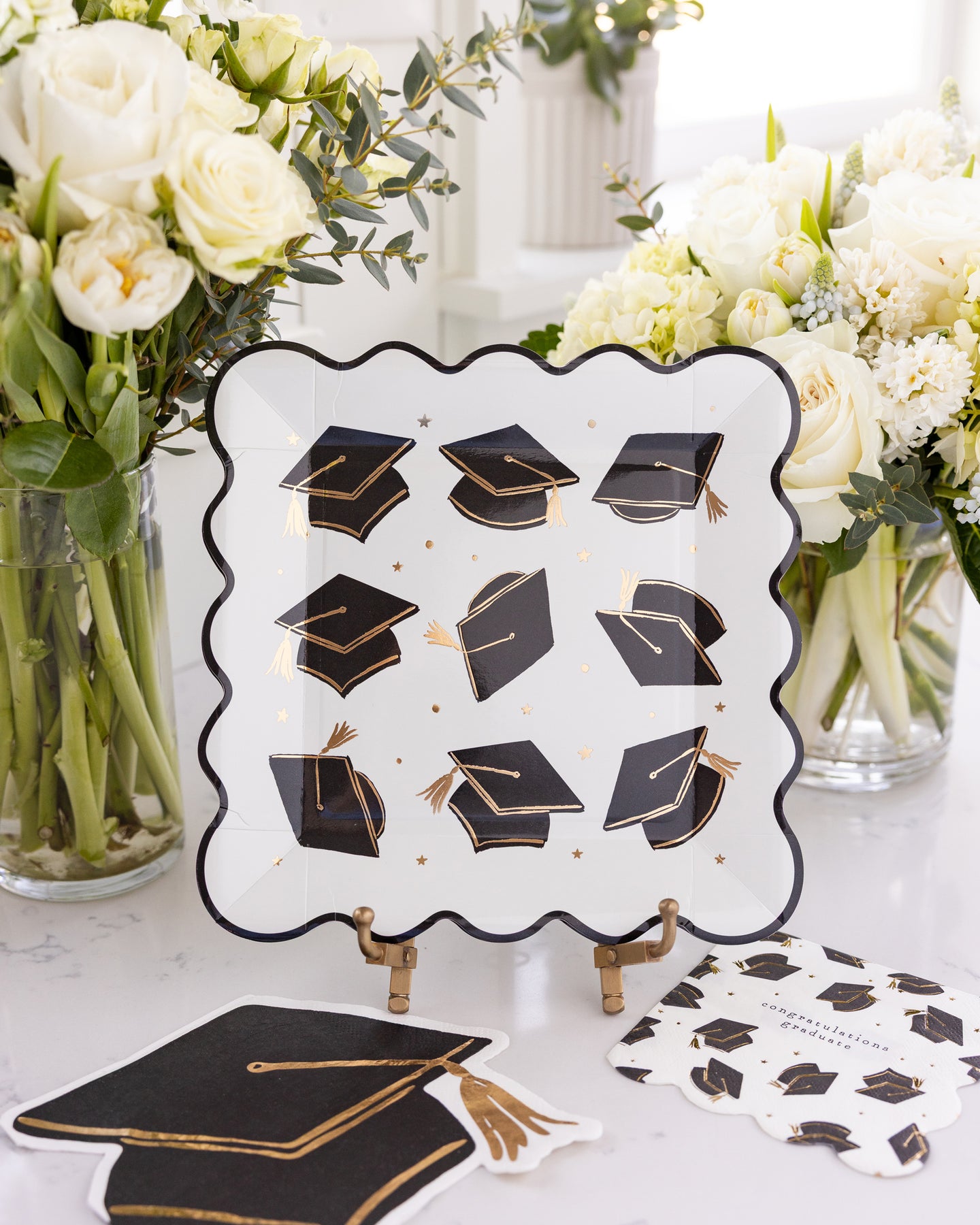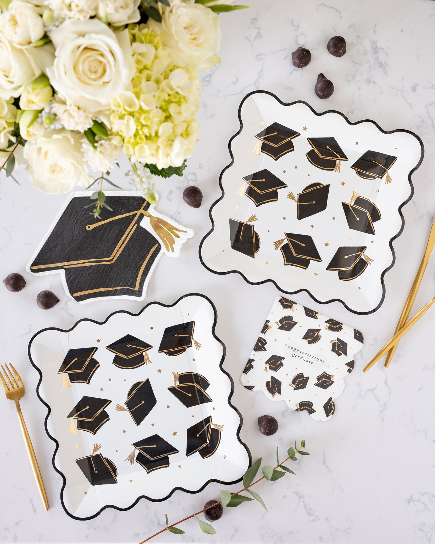 • Grad caps paper plates in black with gold foil detailing