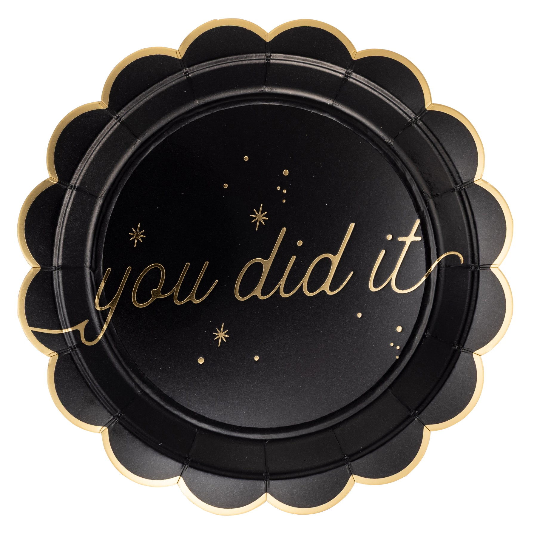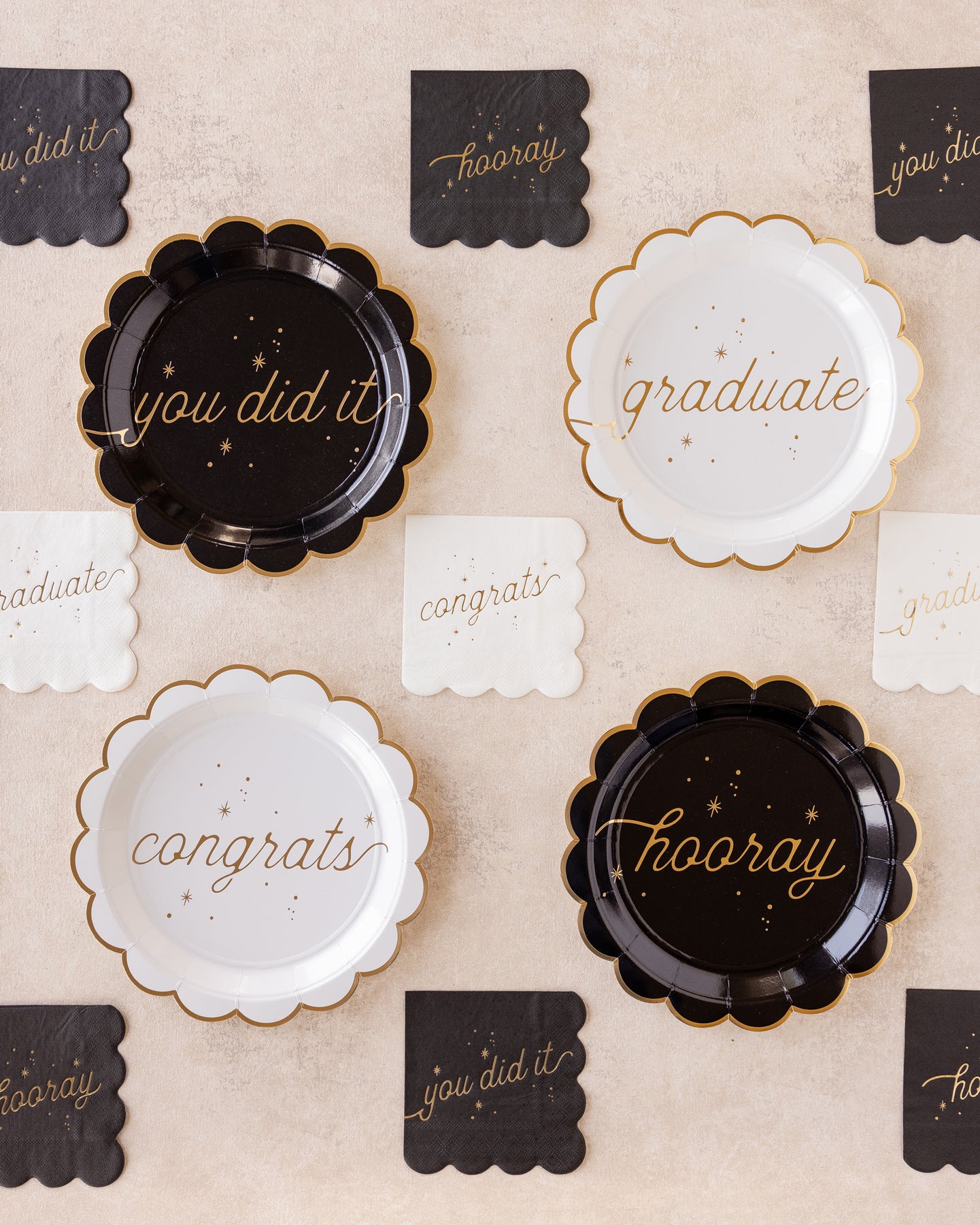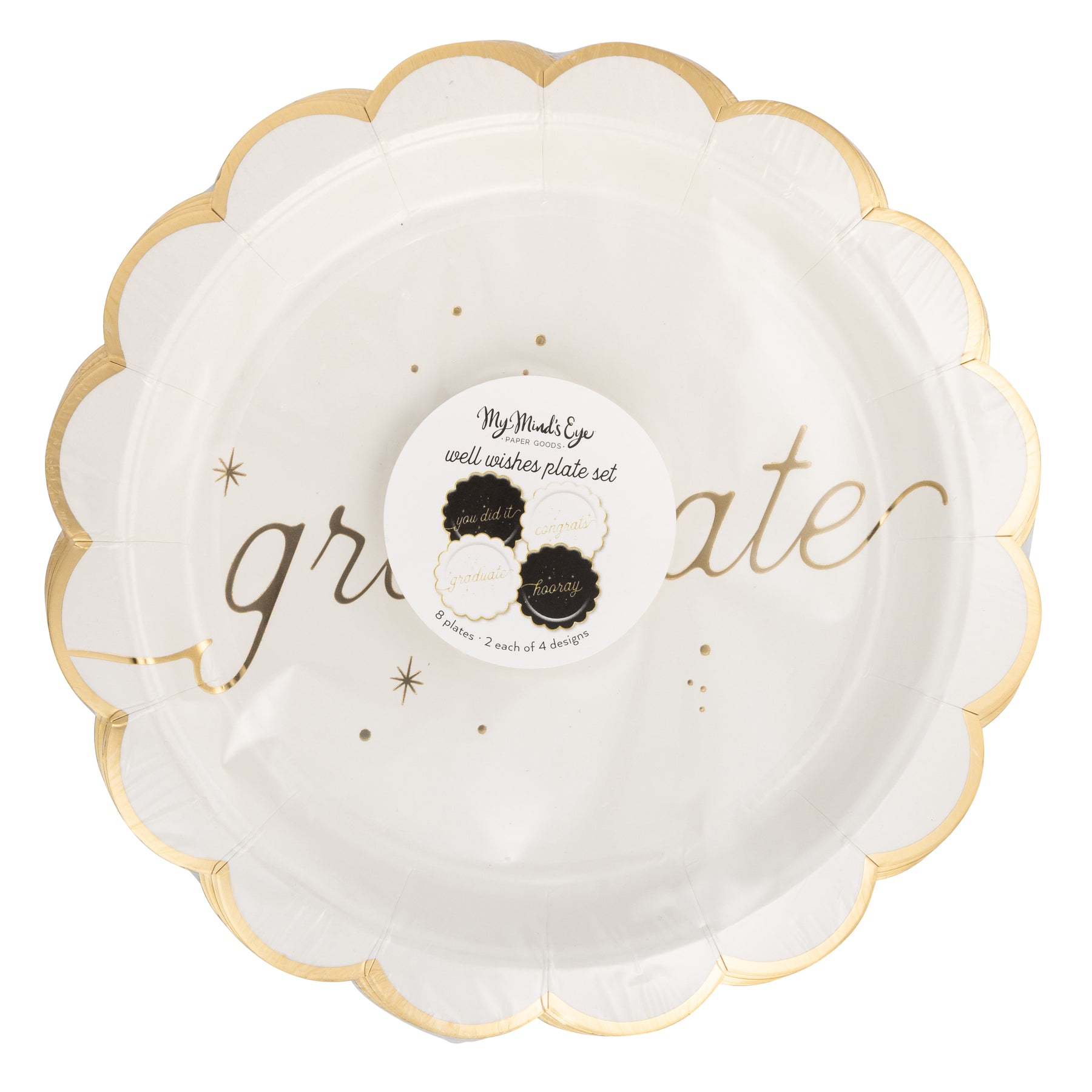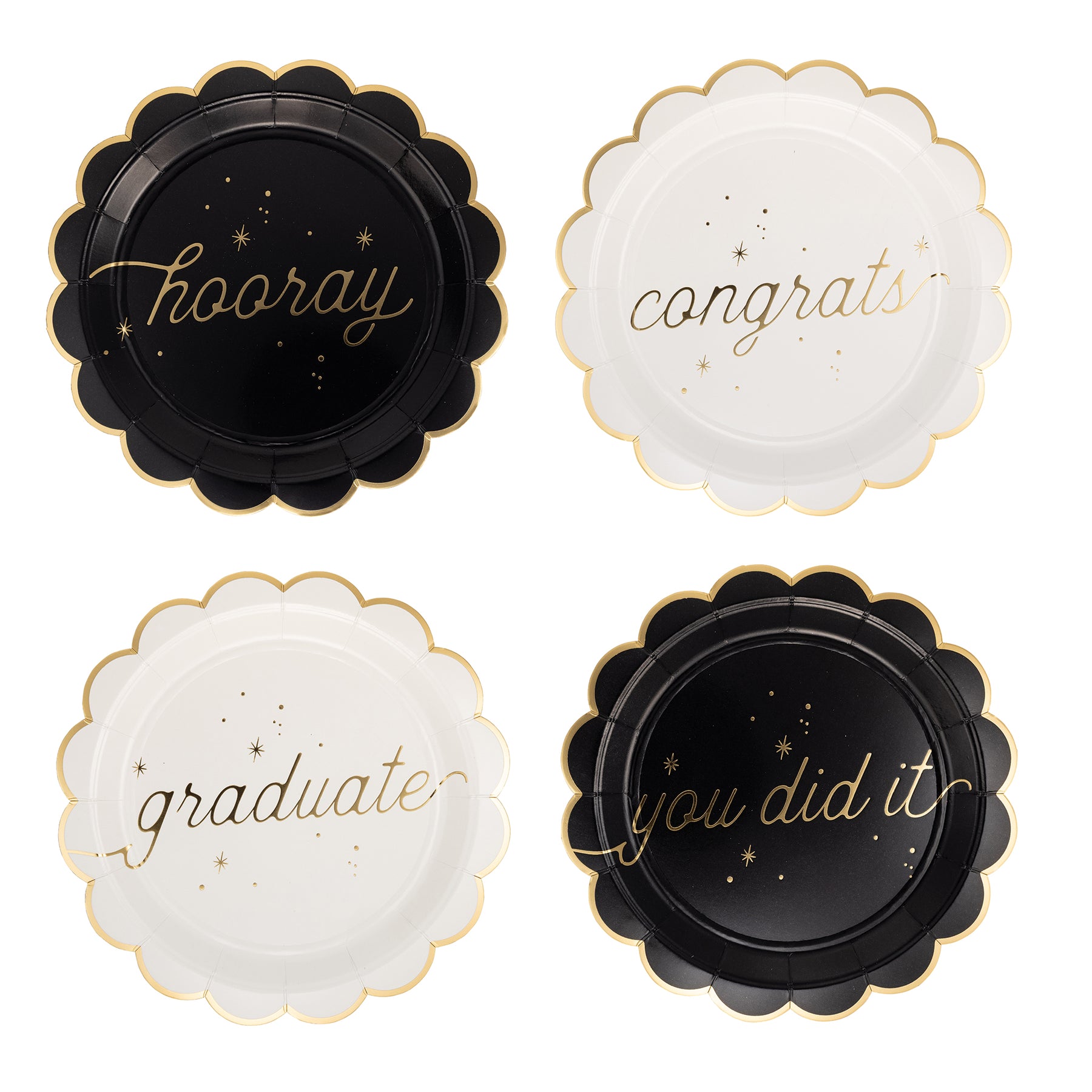 • Set of 8 plates, 2 of each design: "CONGRATS," "HOORAY," "GRADUATE," and "YOU DID IT"