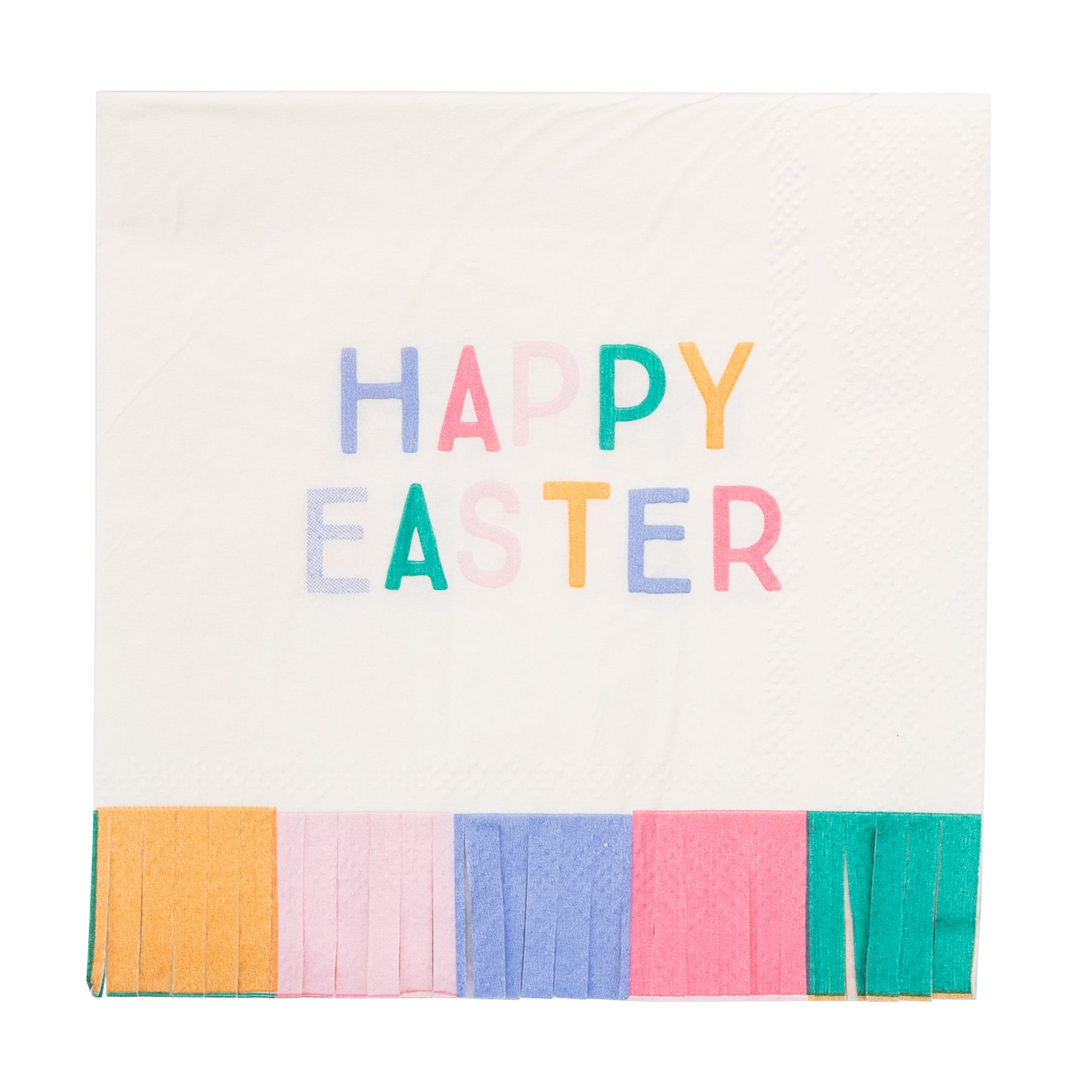 Hop into Easter celebration with these vibrant fringed cocktail napkins! Featuring a cheerful Happy Easter design in a rainbow of colors, they're the perfect finishing touch for your holiday gathering. The playful fringe detailing adds festive flair to any spring soirée, while the practical cocktail size keeps drinks and appetizers mess-free.