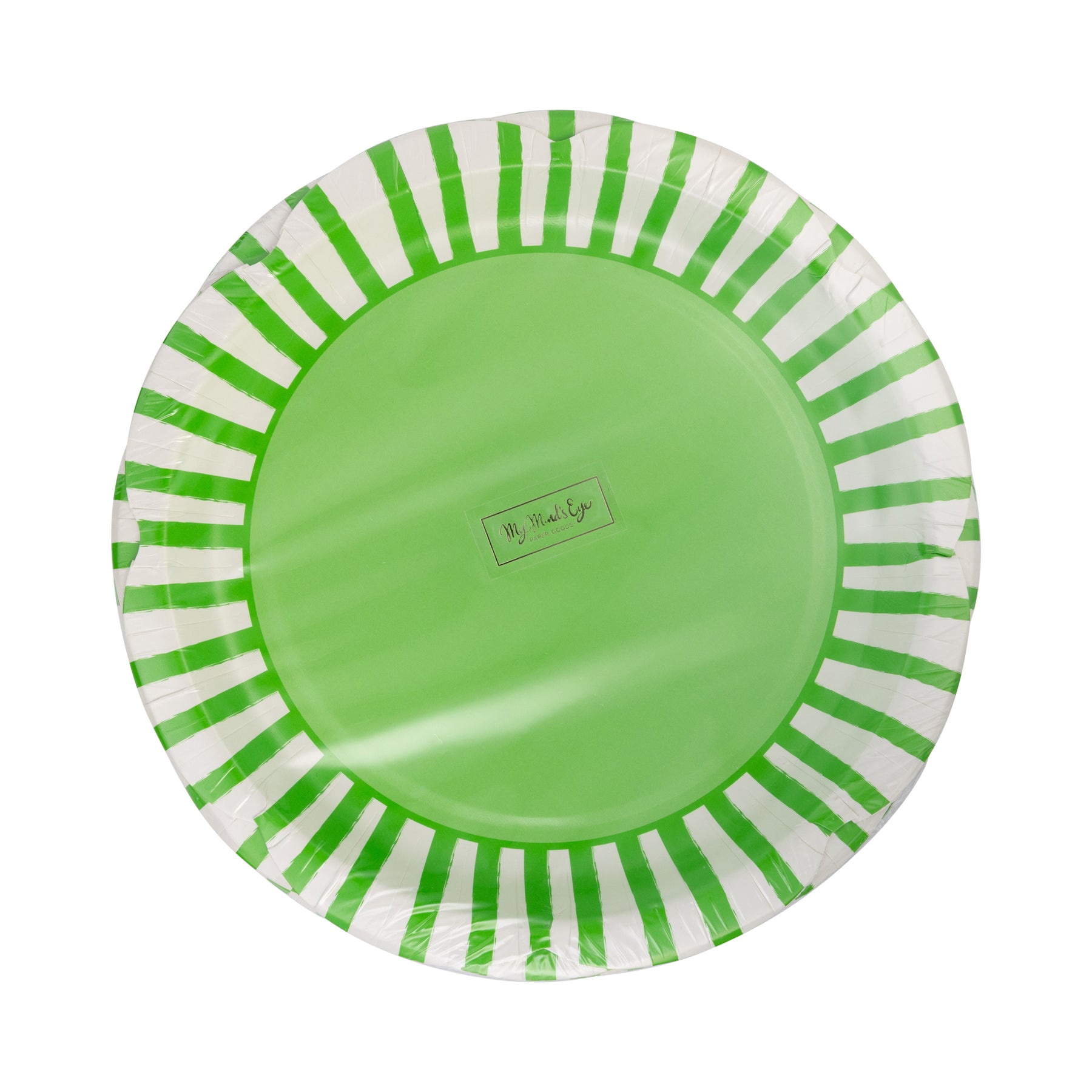 Elevate your party table with our vibrant Green Striped Scallops 9" Plate. Its lively green stripes and scalloped edges bring a fresh, festive touch, making every gathering feel special. Perfectly sized for appetizers, desserts, or main courses, these plates coordinate effortlessly with other party decor to create a cohesive and cheerful table setting.