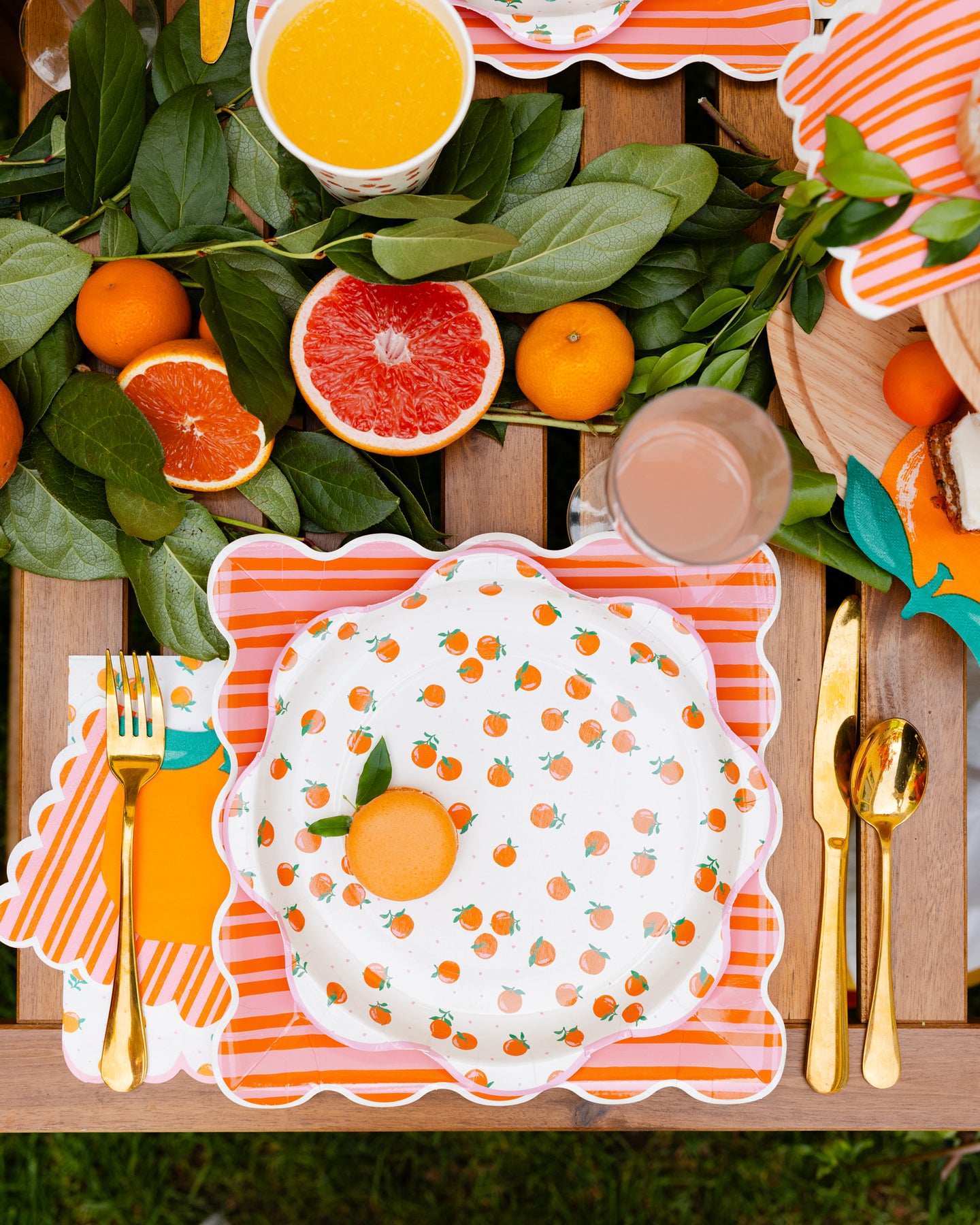 Elevate your party table with our Oranges 10-inch Plate, featuring a lively scattered oranges design. Perfect for serving appetizers or snacks, its vibrant pattern adds a refreshing, festive touch that brightens any celebration. Durable and stylish, this plate is sure to keep the fun rolling at your next gathering.