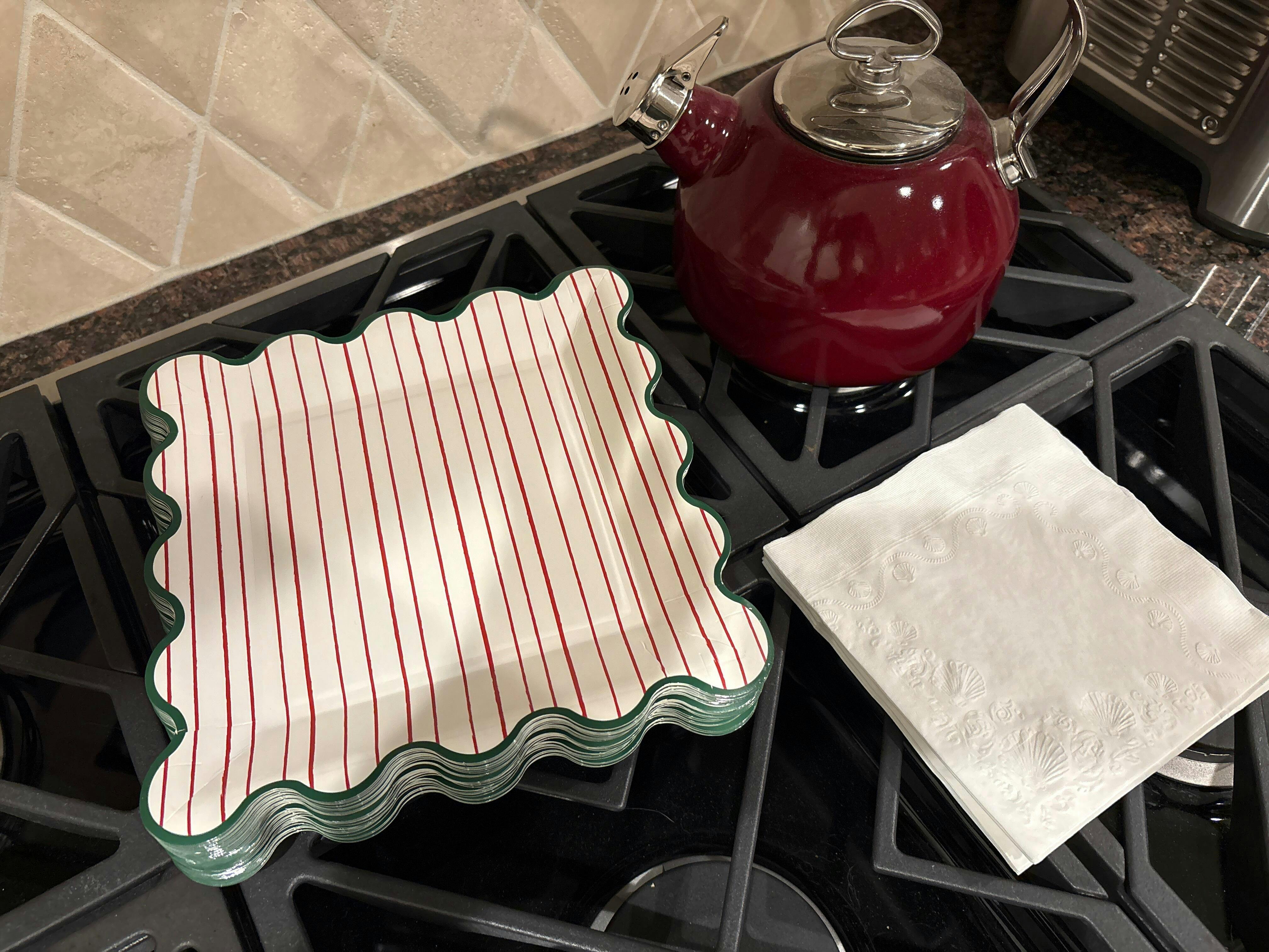Cute plates with a sweet scalloped edge. Delicate stripes allow for multiple occasion use, despite the Christmas label. And a nice size: Big enough for a small dinner plate. But small enough to be used as an ample-sized appetizer/dessert plate.